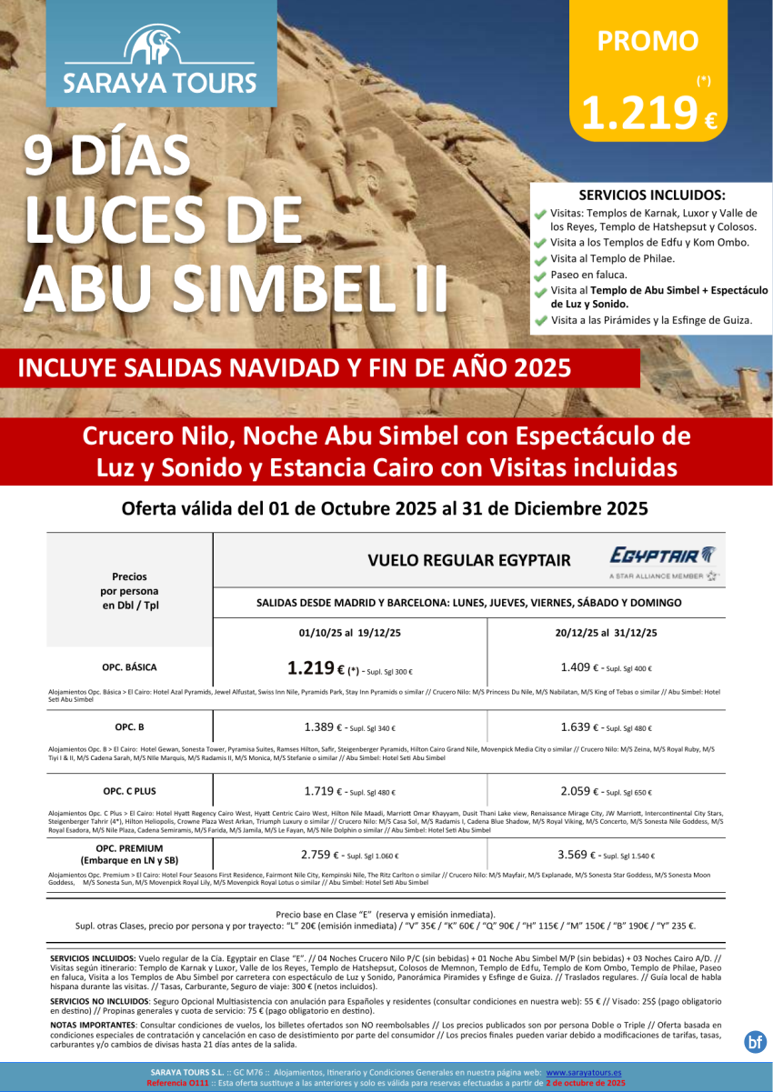 Luces de Abu Simbel 9d. Mad y Bcn*Crucero, Noche en Abu Simbel+Espectáculo y Cairo con Visitas*hasta Sep26